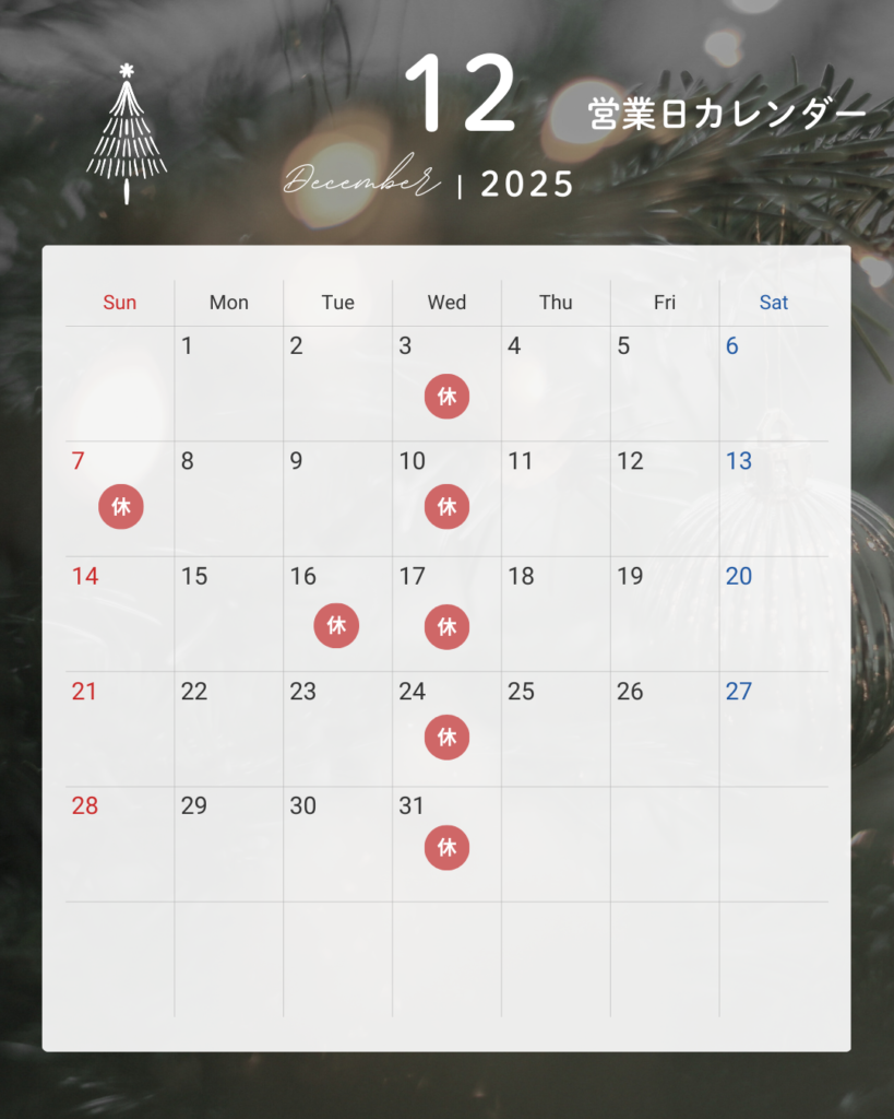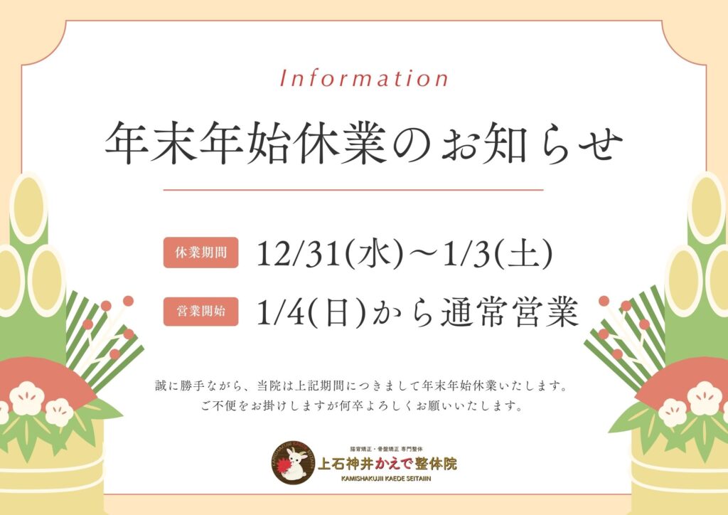 長期休暇に入ると、普段とは違う生活リズムや寒さの影響で身体に負担がかかりやすくなります。一年頑張った身体を整えるためにも、年内のメンテナンスをご検討いただければ嬉しく思います。