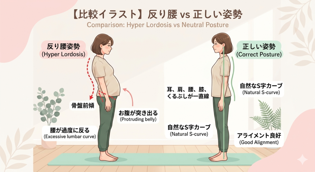 出産後は骨盤が不安定になりやすく、赤ちゃんを抱っこするときの前傾姿勢や授乳時の姿勢が重なって、反り腰が悪化するケースも多く見られます。