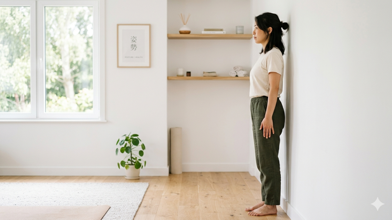 かかと・お尻・肩・頭の4点を壁にぴったりつけて立ってみてください。このとき腰と壁のすき間に手のひら1枚以上(約3〜4cm以上)が入る場合、反り腰の可能性があります。すき間がほとんどない場合は猫背、大きくすき間が開く場合は反り腰のサインです。